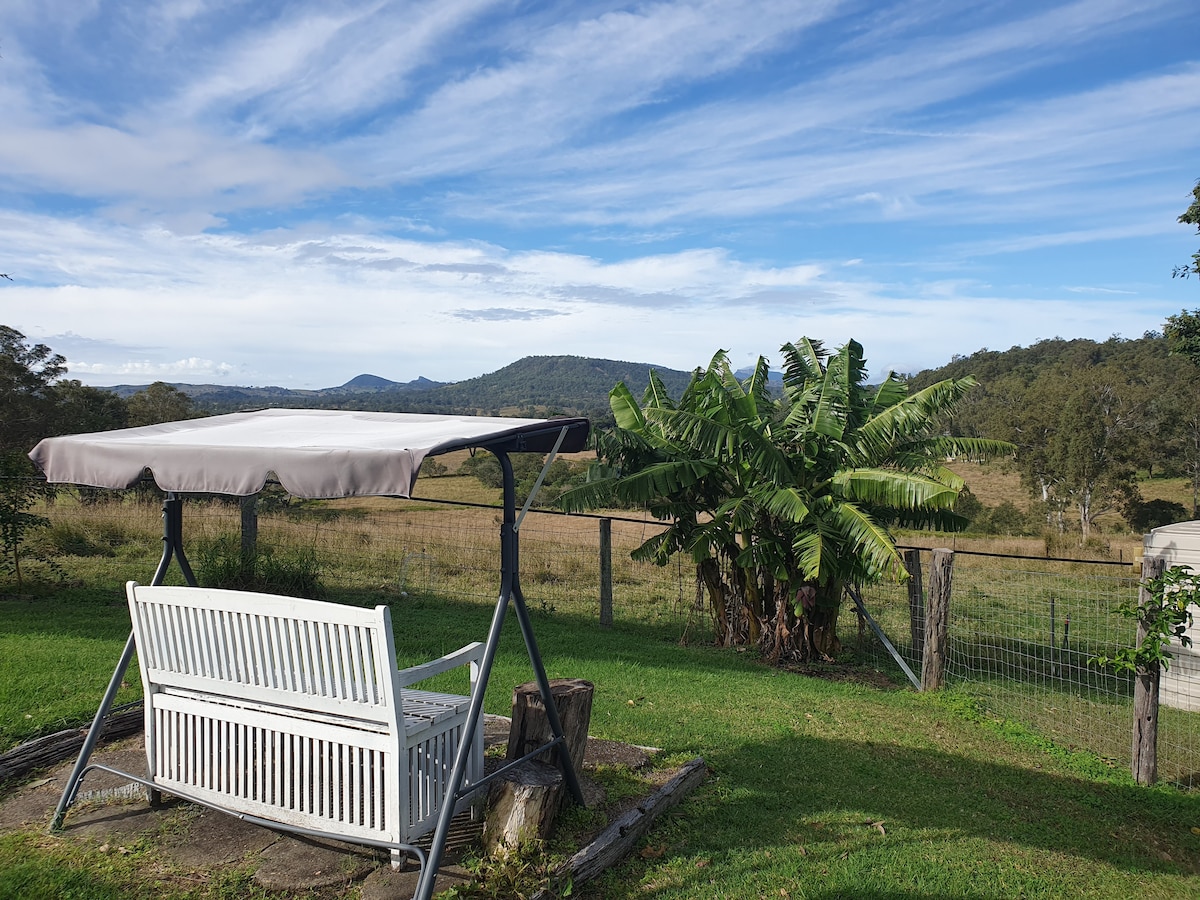 Een perfecte ontsnapping naar het land, je eigen rustige hoeve op 50 hectare genesteld op een heuvel met een adembenemend uitzicht op de schilderachtige randbergen. In iets meer dan een uur van Brisbane kun je ontspannen op het dek genieten van een glas wijn van een van de nabijgelegen wijnmakerijen, rond de open haard zitten of marshmallows roosteren in de vuurplaats. De hoeve ligt op slechts zeven minuten rijden van Boonah township en aan dezelfde weg en op slechts 3 minuten rijden van Kooroomba Vineyard & Lavender Farm.