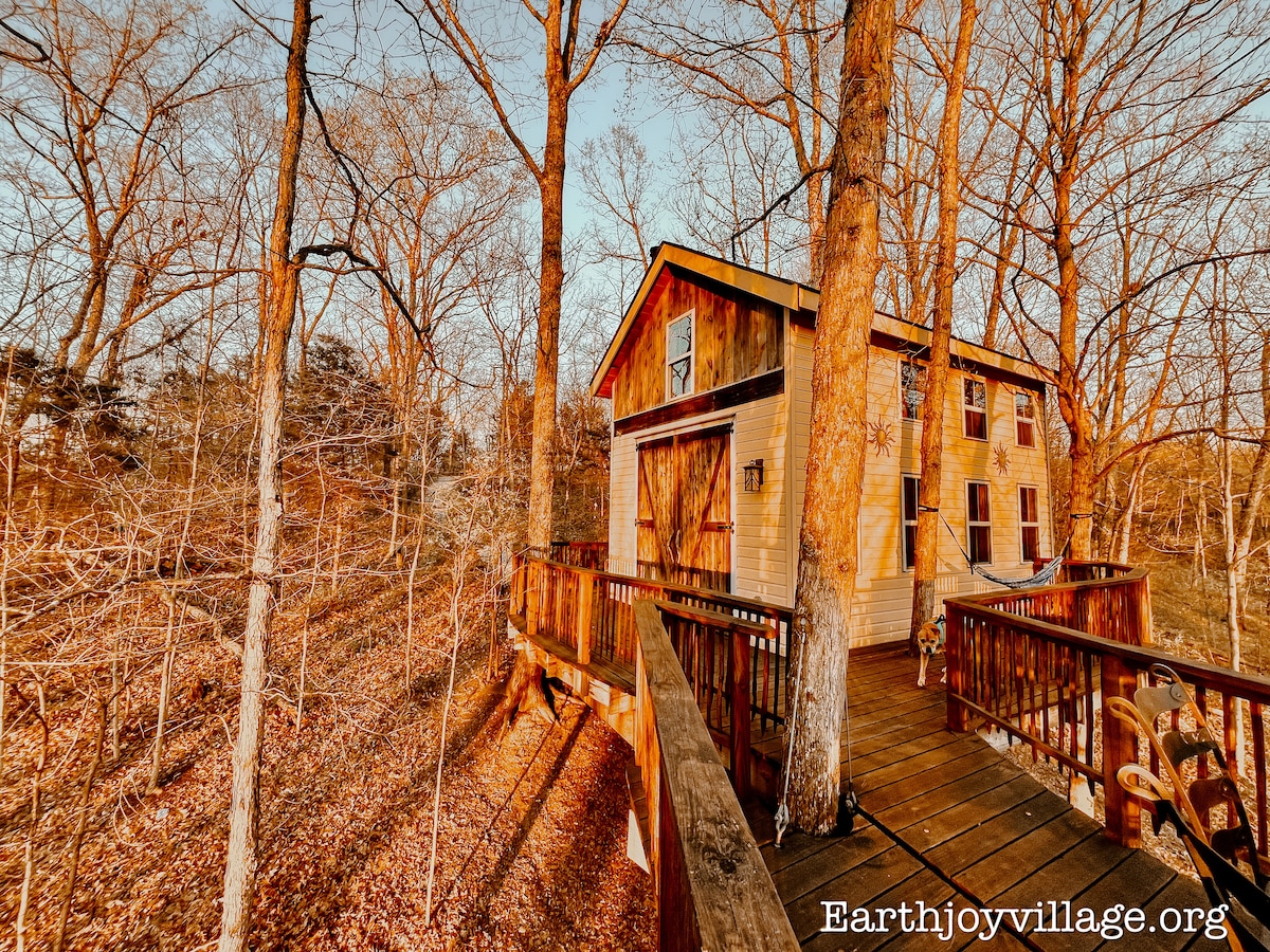 Dit is de wereldberoemde BOOMHUT zoals te zien op Animal Planet – TreeHouse Masters – Kentucky Climbers Cottage, gebouwd door Pete. Deze boomhut is ideaal voor wie tot rust wil komen en een zelfvoorzienende ervaring in de natuur wil hebben. Loop via een helling de boomhut in. De grote schuurdeuren openen om de buitenwereld binnen te laten. Er is een kingsize bed, 2 leren banken en hangmatbedden. Het beste voor 2 volwassenen en 3 kinderen. Heeft elektriciteit, airconditioning en een houtkachel. Wanneer genomen? Zie Aliyah of Hickory-boomhut of Tiny home Schoolie 'The Love Bus'