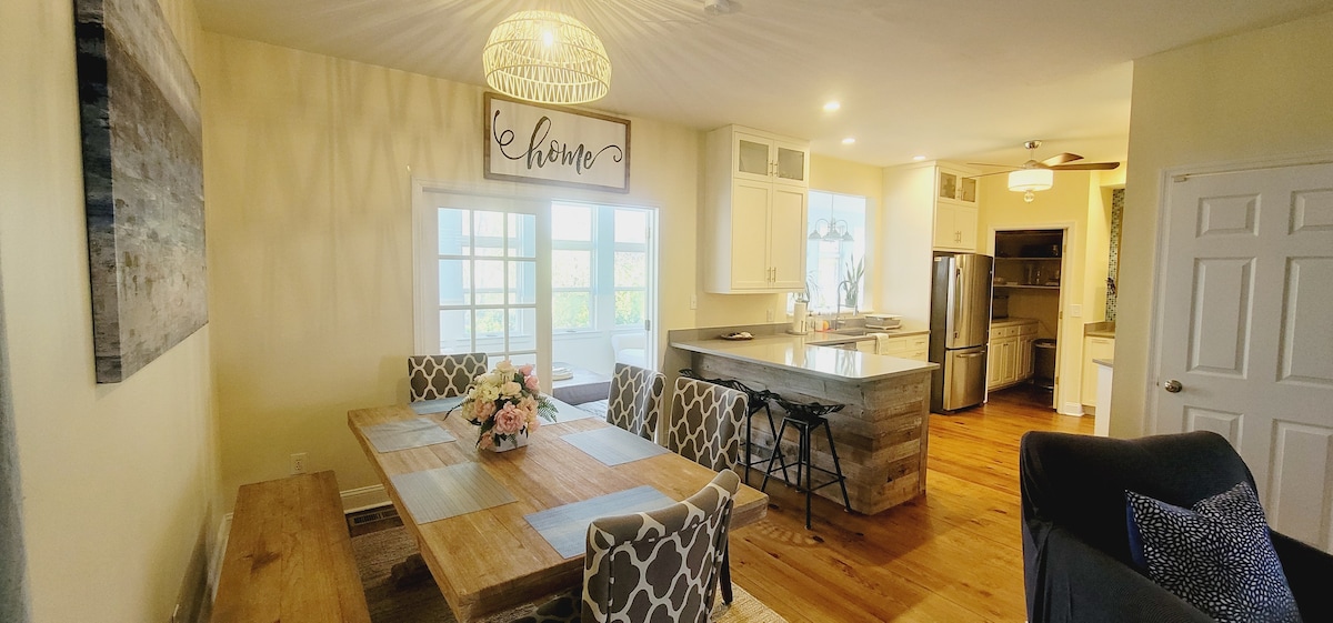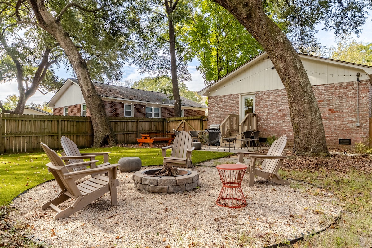 Vers bijgewerkt huis verscholen in een rustige buurt 1/2 weg b/t Sullivan's Isle & Shem Creek. Overdekte patio aan de achterkant: 55 in smart-tv, comfortabele stoelen, gasvuurplaats, gasgrill, eettafel, gemonteerde ventilatoren om je koel te houden en de insecten weg. Strandstoelen/handdoeken/parasol inbegrepen. Neem je honden mee! Grote omheinde achtertuin met hondenzakken aanwezig en een hangmat bij de bananenbomen! Open plattegrond, volledig gevulde keuken en buitendouche! Mt Pleasant bedrijfsvergunning # 20124588 str vergunning ST260297