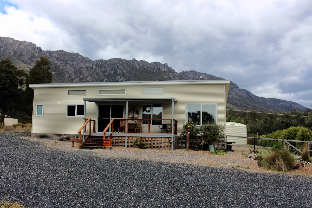 Tiny house with a view of Cradle Mountain. Welcome breakfast bread, milk Included. Relax on the deck and unwind. It has a well equipped kitchen with fridge, gas stove, rangehood, microwave, kettle, toaster and all the cooking essentials. The custom built stairs lead up to the loft bunk bed (height 100-110 cm) area. It is a self-contained accommodation. Bathroom well equipped with all the essentials. Eco friendly powered by the Sun. Clean Eco Friendly accommodation for those who love nature.