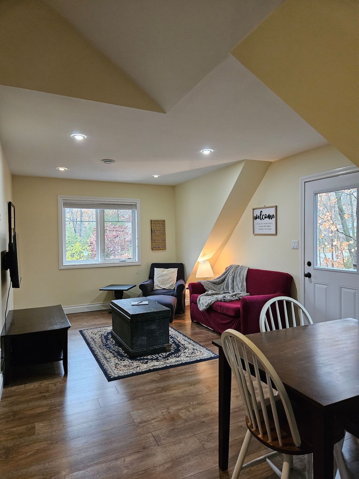 Ontspan in onze rustige gastsuite die aan ons huis is verbonden en in de buurt ligt van Mount St-Louis Moonstone, Vetta Nordic Spa en het gezellige stadje Coldwater. Met een eigen ingang, een hot tub (dagelijks toegankelijk tussen 8.00 en 22.00 uur) en een serene bosomgeving is deze ruimte ontworpen voor gasten die rust, stilte en natuur waarderen. We vragen gasten om onze waardering voor een rustige omgeving te delen.
