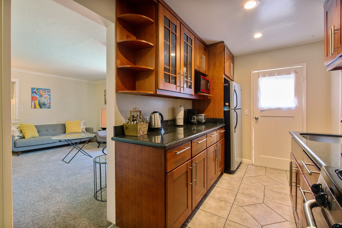 Welkom bij Savvy Studio~een schoon en rustig appartement waar je in alle rust kunt ontspannen of werken. Gelegen in een zelfstandige vleugel van een pittige Eichler Mid-Century-woning, kom je binnen via een eigen unieke atrium-breezeway naar de vergrendelbare ingang van je studio-appartement met een comfortabel full-size bed, tafel om te werken of te dineren, mini-keuken en eigen volledige badkamer.