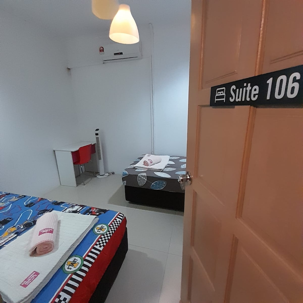 Suite 106 is with 2 super single, study table and chair and wardrobe. 2 rooms share 1 bathroom. This room is in G floor. Shared bathroom, kitchen, living area and parking. There are 6 rooms in the house. Double storey terrace house.
