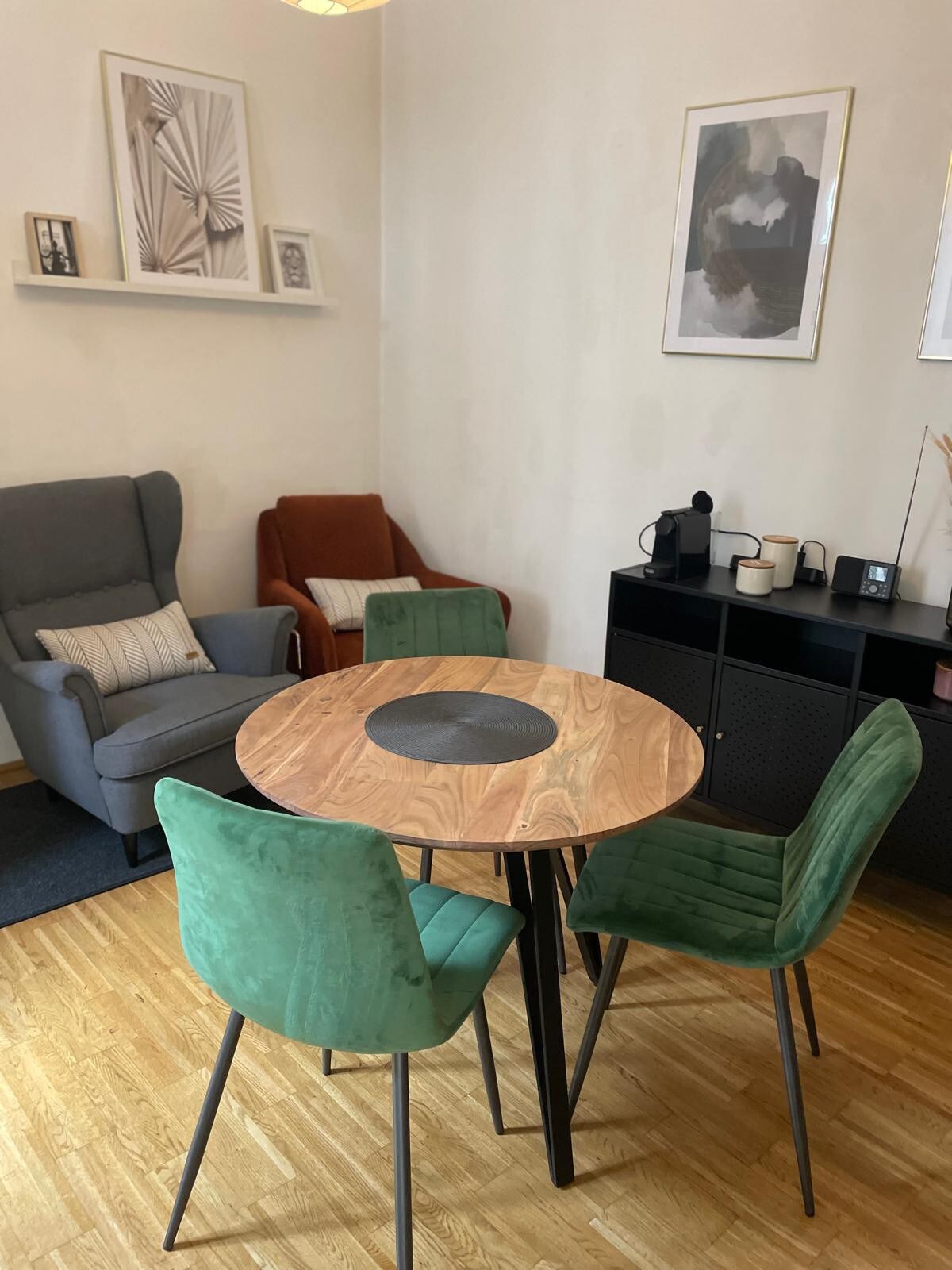 Voel je thuis! De ideale accommodatie voor jou - of het nu voor werk, evenementenbezoeken of een stedentrip met je dierbaren is. Het liefdevol ingerichte oude gebouwappartement omhult je met haar charme - en vanaf het eerste moment. Met aandacht voor detail is rekening gehouden met alles wat je nodig hebt tijdens het verblijf. Naast de volledig uitgeruste keuken, grote woonkamer en een moderne werkplek (snelle wifi), biedt het appartement je een geweldige badkamer met wasdroger.