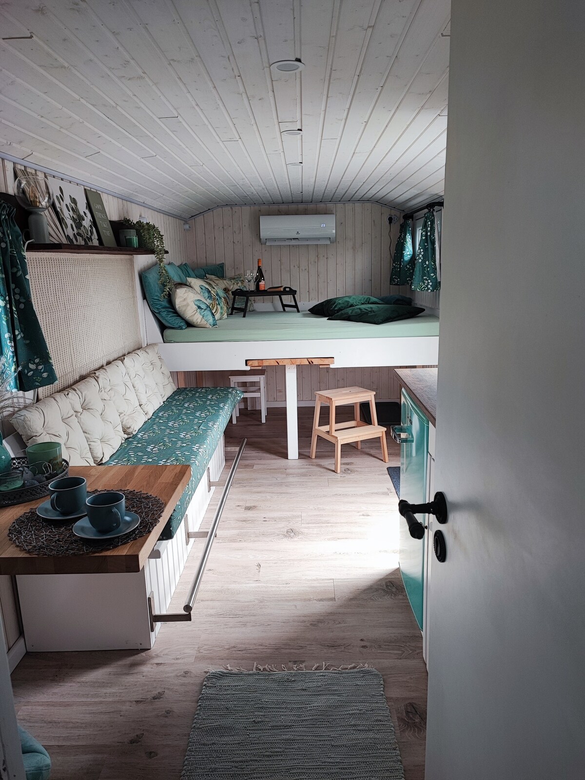 Op een heuvel, genesteld door oude bomen, staat 1 van de 3 onconventionele huisjes, elk met 2 slaapplekken. Bij elk weer (behalve in de winter) kan de hut campingliefhebbers, fietsers of kortetermijnbezoekers een overnachting bieden als alternatief voor de tent. Alleen een slaapzak en een handdoek in de bagage. Het comfort bestaat uit een dak boven je hoofd, een plek om te slapen, een mooi kampvuur en een warme buitendouche met apart toilet.
