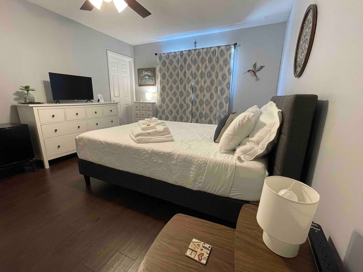 Dit gastenverblijf in een studio heeft een eigen ingang met uitzicht op de vijver en het zwembad vanuit de kamer. De omslagfoto is er een van de zonsopgang van Wilmington op het strand. Deze gezellige kamer heeft een comfortabel kingsize bed, 1 uittrekbare slaapbank. Je eigen badkamer gevuld met handdoeken en mini toiletartikelen als je ze vergeet. De buurt is erg rustig en veilig. Ik heb een koffiezetapparaat en kopjes voor de ochtendkop koffie!!