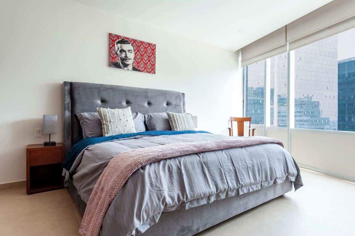 Geniet van een volledig uitgeruste keuken, snel internet, een comfortabel kingsize bed en een slaapbank, en twee tv's, allemaal aangevuld met een geweldig uitzicht. Het appartement biedt 24/7 beveiliging, een fantastisch zwembad met panoramisch uitzicht op de stad, een volledig uitgeruste fitnessruimte, een speeltuin en een grillruimte. Gelegen op slechts drie minuten lopen van de nieuwe Amerikaanse ambassade. Verken het nabijgelegen Soumaya Museum, supermarkten, het Antara-winkelcentrum, verschillende restaurants en de levendige wijk Polanco.