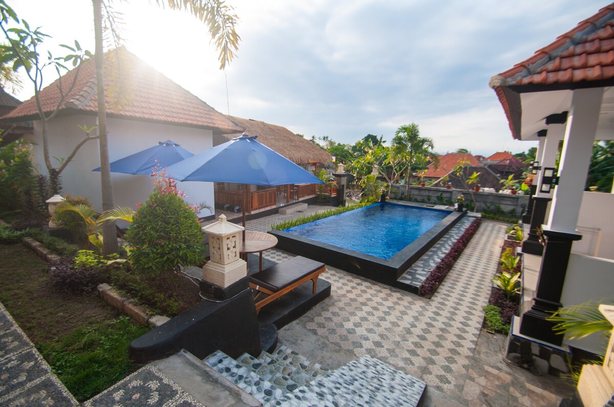 Deze accommodatie ligt in Nusa Lembongan, op 200 meter van het strand Jungutbatu, en biedt accommodatie met een terras, gratis WiFi, een 24-uursreceptie en een gedeelde keuken. Deze bed & breakfast heeft een eigen zwembad, een tuin en gratis privéparkeergelegenheid. De bed & breakfast is voorzien van airconditioning, een zithoek en 1 badkamer met een douche. De bed & breakfast biedt een continentaal of à la carte ontbijt.