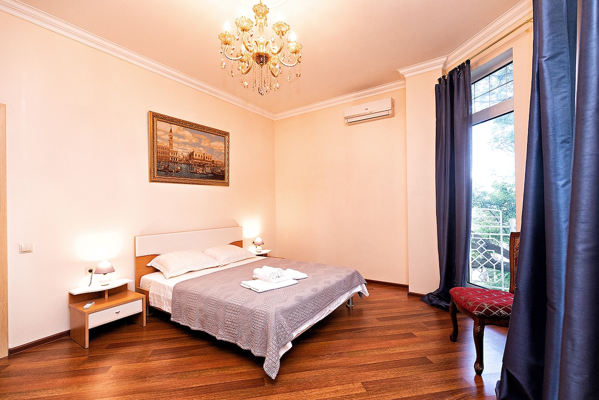 Het appartement is gelegen in het centrum van Odessa op het adres: 1 Ekaterininskaya Street; Potemkinskaya Stairs, Deribasovskaya - allemaal in de buurt - 2 minuten, frisse designer renovatie, terwijl de binnenplaats rustig, schoon, met een codeslot; eigen ingang. Hoofdslaapplaatsen tweepersoonsbed + tweepersoonsslaapbank. Twee airconditioners, wasmachine, 2 tv's, magnetron, haardroger, strijkijzer, douche, volledige set borden, slippers. Alle beddengoed en handdoeken aanwezig.