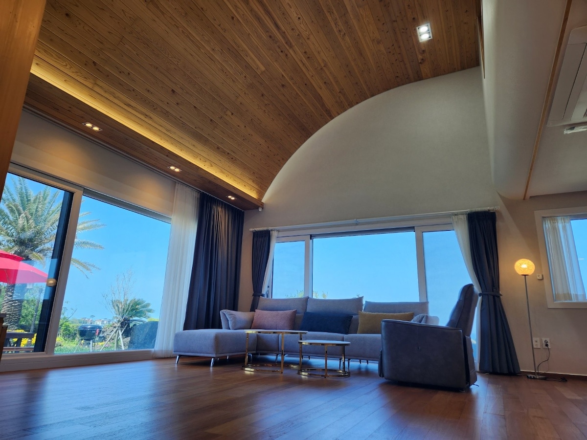 Hello. It is located on a cliff in the center of Seogwipo, so it has a perfect ocean view with permanent views. Our space is a private, small, detached space that is separate from other travelers, so guests can use it without ambient noise. Rooms are divided into bedrooms and living rooms with 20 pyeong, including rooms You can see the sea from the swimming pool, the cafe where you can have breakfast, and the outdoor garden.