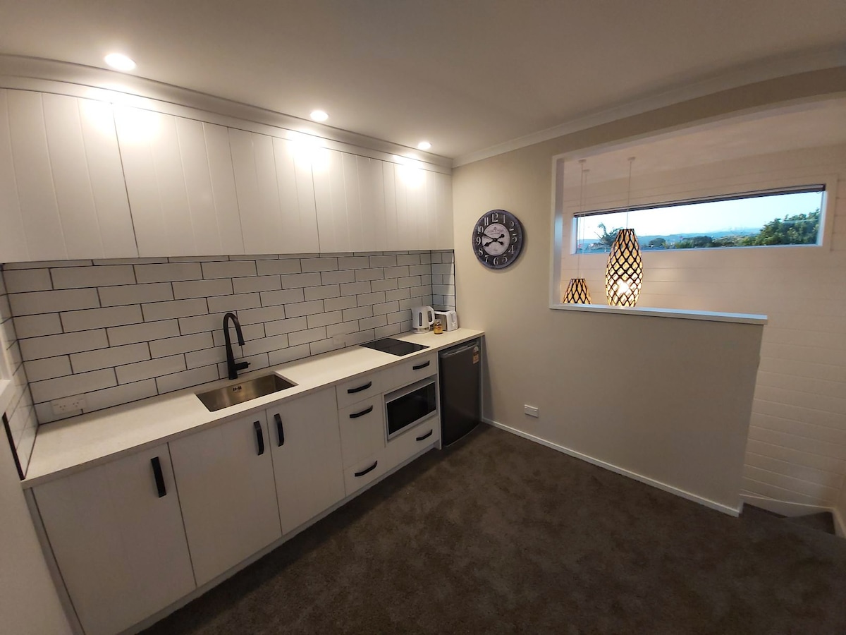 Wij bieden onze goed ingerichte zelfstandige studio aan ons thuis. Een privéruimte met airconditioning en je eigen toegang door zelf in te checken. Gratis off-street parkeren. Een geweldige uitvalsbasis voor je verblijf in Hawkes Bay. De aparte slaapkamer heeft een queen size bed. Je hebt een lounge met kitchenette, een grote badkamer en een apart toilet. Een wasmachine. Er is een eigen, zonovergoten binnenplaats met tuinmeubilair, parasol en gasbarbecue om te ontspannen na het verkennen van onze prachtige regio