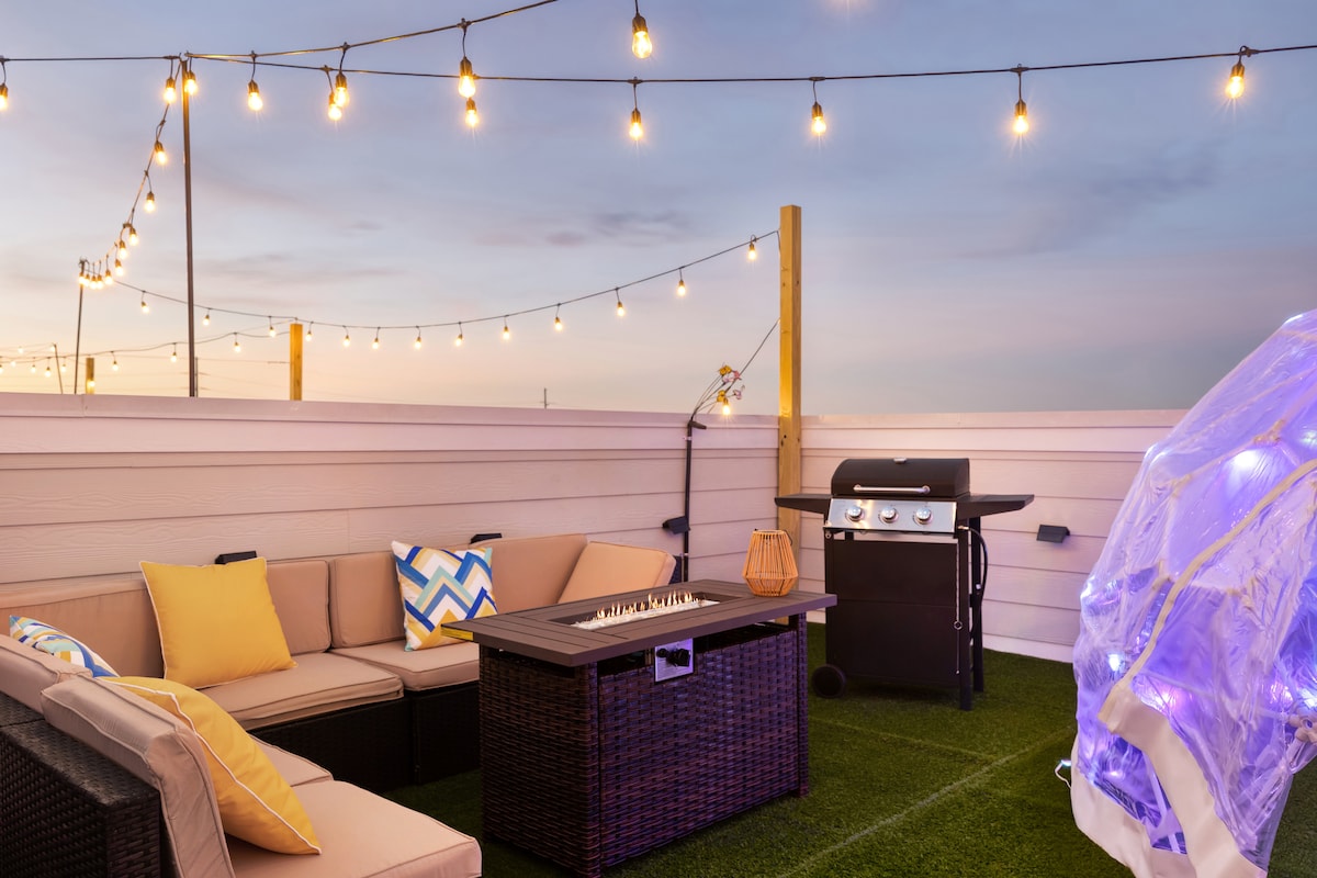 Hallo allemaal! Welkom in je ultieme Nashville-uitje, een ruim privé-rijhuis in het bruisende East Nashville, op slechts 2 mijl (minuten) van Broadway's honky-tonks, livemuziek en energie in het centrum. Perfect voor vrienden, gezinnen, vrijgezellenfeestjes of muziekliefhebbers die ruimte willen om te ontspannen en te spelen. Geniet van exclusieve voorzieningen die zelden in Nashville te vinden zijn: een eigen bioscoop, een speelkamer en een enorm dak met episch uitzicht op de stad voor drankjes bij zonsondergang, sterrenkijken of groepsuitjes.