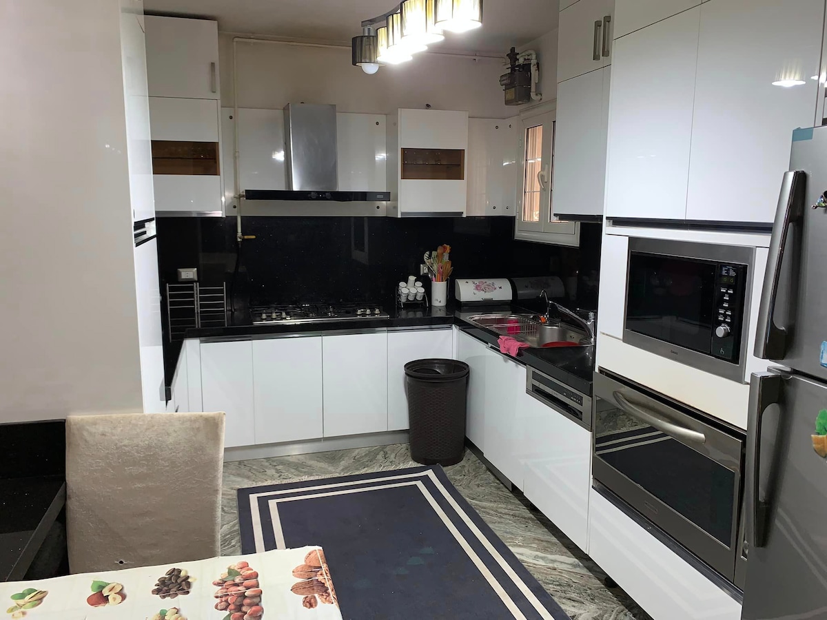 Geniet met het hele gezin in deze stijlvolle woning. Het huis bestaat uit 3 kamers /receptie /keuken /2 badkamers Volledig voorzien van airconditioning / open uitzicht. Modern / nieuw meubilair De apparaten zijn nieuw / Dicht bij City Stars/Dicht bij Cairo Airport ongeveer 10 minuten Dicht bij alle diensten / supermarkt / internationale en Egyptische banken / franchises Restaurants / gemakkelijke toegang tot elke plek in Caïro via de locatie van het appartement