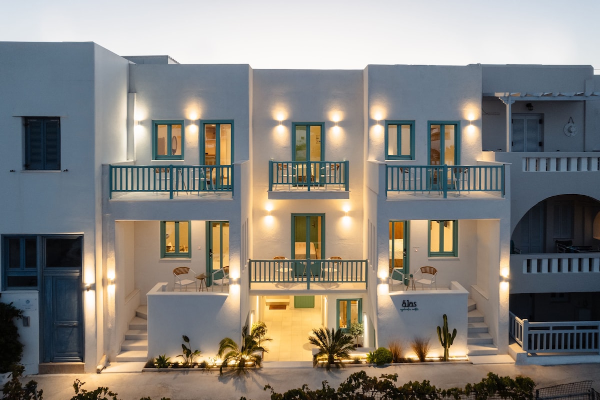 Welkom in ons charmante kleine cycladische hotel in Naxos, Griekenland. Ons intieme hotel ligt op het strand van Agios Prokopios en beschikt over zes uniek ontworpen kamers, elk met een rustig en gezellig toevluchtsoord voor onze gasten. Alas cycladic suites ligt op slechts 25 meter van het beste strand van het eiland, op 5 km van de stad Naxos en op 2,5 km van de luchthaven. Op slechts twee stappen afstand is alles wat je nodig hebt, van strandbars, restaurants tot winkels en supermarkten. Ook het busstation en de taxistandplaats ligt op een minuut afstand.
