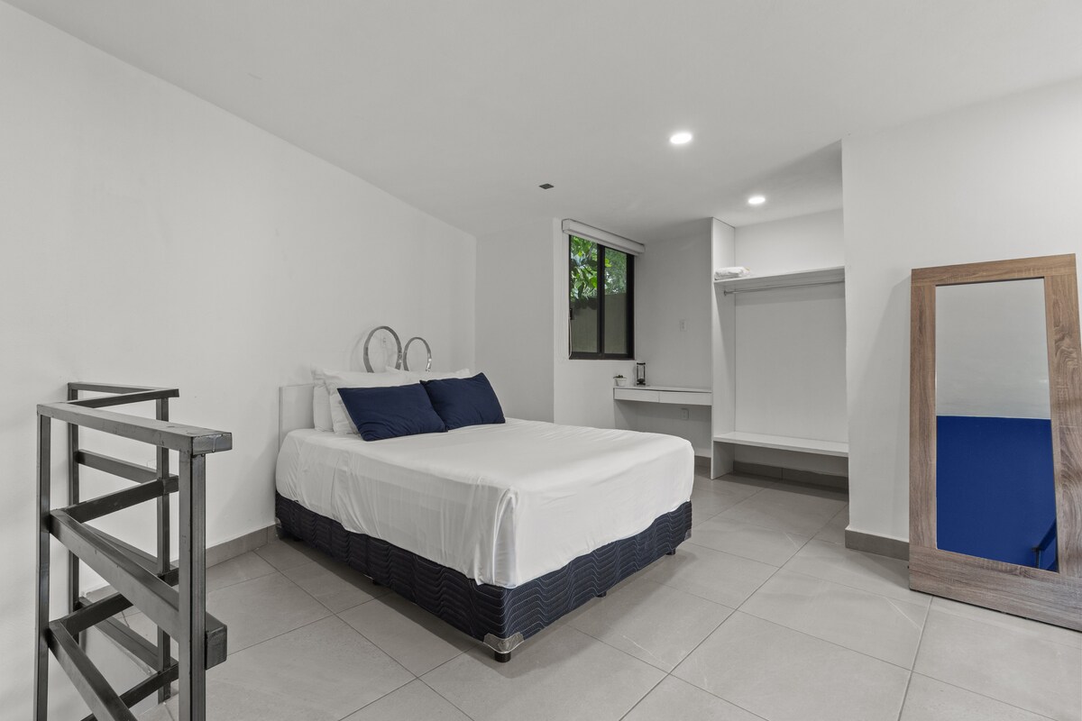 Charmante studio met een queensize bed in een boetiekwoning (slechts 8 appartementen) in de meest gewilde buurt van Bucerias. Loop 2 blokken naar het strand, koel af in het VERWARMDE zwembad of geniet van de zonsondergang vanaf de palapa op het dak. Omdat je in het hart van de stad bent, kun je naar de beste restaurants, cafés en kunstgaleries lopen die deze schilderachtige strandstad te bieden heeft. Of je nu een week of een maand verblijft, het is perfect om het best bewaarde geheim in de baai te ervaren.