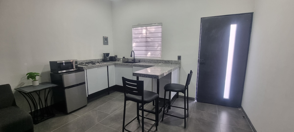 Este elegante, nuevo y amplio alojamiento se encuentra cerca del IMSS 16 y 71 en la zona residencial. Está totalmente equipado incluyendo cocineta, baño y con MiniSplit para frío y calor. Incluye todos los servicios y cuenta con lavandería equipada con todo nuevo y una acogedora terraza. La limpieza es lo mas importante