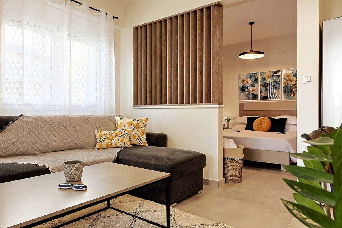 Ervaar de perfecte mix van erfgoed uit de jaren 60 en modern minimalisme. Dit door architecten ontworpen appartement ligt op slechts enkele stappen van het gemeentelijke Katerini-park en biedt een ontsnapping in het hart van de stad. De ruimte is gerenoveerd om zijn vintage ziel te behouden en tegelijkertijd elk hedendaags comfort te bieden. Of je hier nu bent voor een snelle stedentrip of als uitvalsbasis om de berg Olympus en de nabijgelegen stranden te verkennen, je zult genieten van de strakke lijnen, het natuurlijke licht en de rustige sfeer.