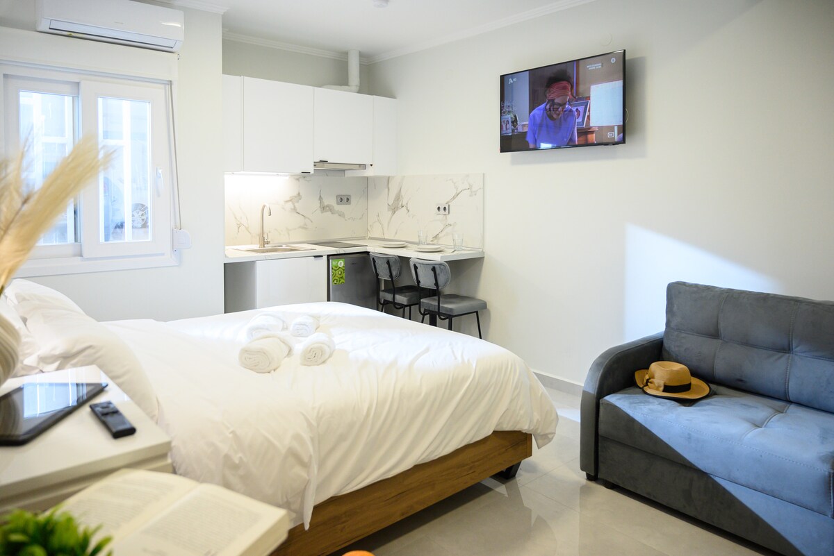 Gloednieuwe studio met moderne inrichting met een uniek queensize bed en ingewikkelde valse plafondontwerpen (38 m²). De studio is gelegen in het centrum van de stad en ligt op minder dan 10 minuten van de luchthaven en vele winkelcentra. Met 3 minuten lopen kun je het stadsplein zien en in 10 minuten ben je bij Thermi 's dam. Als je zin hebt om te zwemmen, kun je Halkidiki in 30 minuten bezoeken.