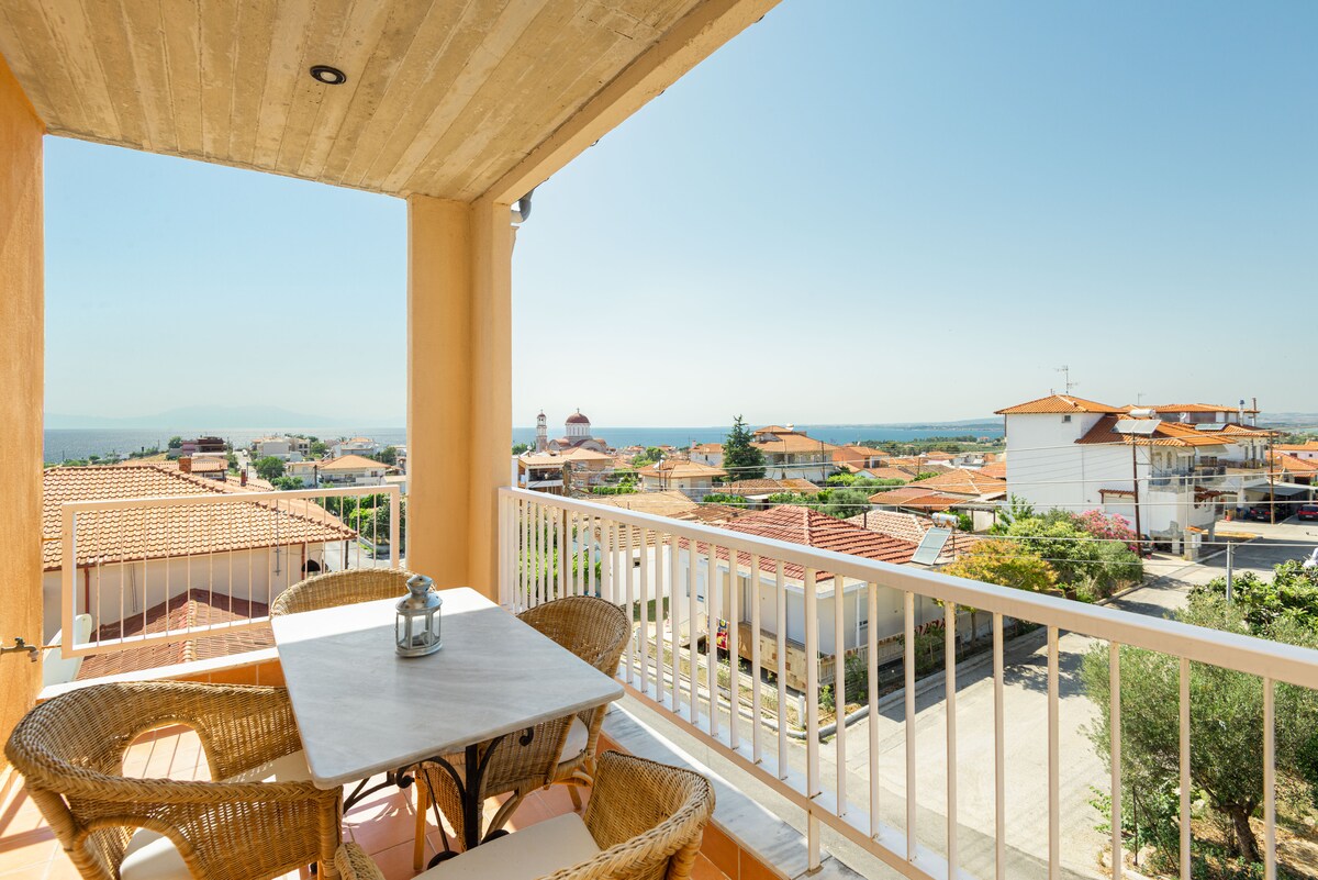 Een luxe appartement op de 1e verdieping in Nea Poteidaia, 30 meter van de kust, met een ongehinderd uitzicht op zee. De 2 persoons hangmat op het balkon is een geweldige ervaring voor diegenen die willen ontspannen over de zee!Geniet van je favoriete series en films op een 50-inch brede smart-tv. Ontspan op de enorme hoekbank of balkonstoelen terwijl je geniet van het ongelooflijke uitzicht!Vlak bij het centrum van het dorp, op slechts een paar meter afstand van de zeegolven!Je kunt de zee 's nachts eigenlijk horen!