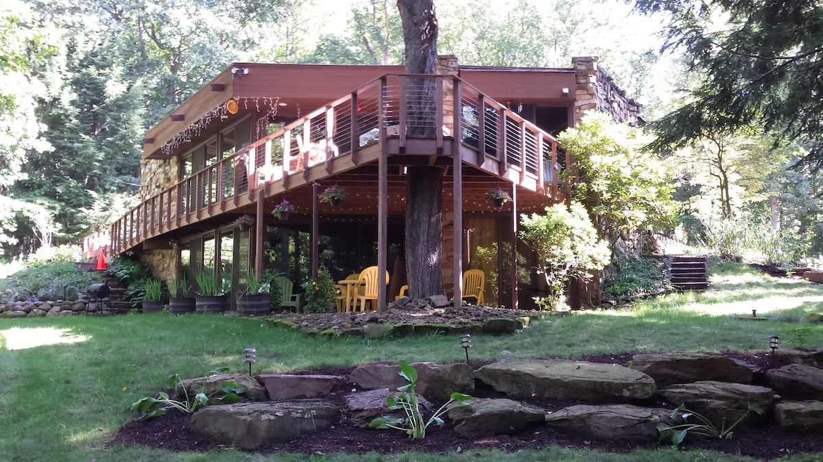 Our Rustic Frank Lloyd Wright inspired contemporary home is located on 10 wooded acres amidst nature's beauty. There are trails in the woods for hiking & cross country skiing. The floor to ceiling walls of glass in the apartment bring the outside in and the private deck provides additional spectacular views of the woods. When not enjoying the wonders of the outdoors, take advantage of our included streaming services. We have a brand new heating and cooling system with 24/7 service!