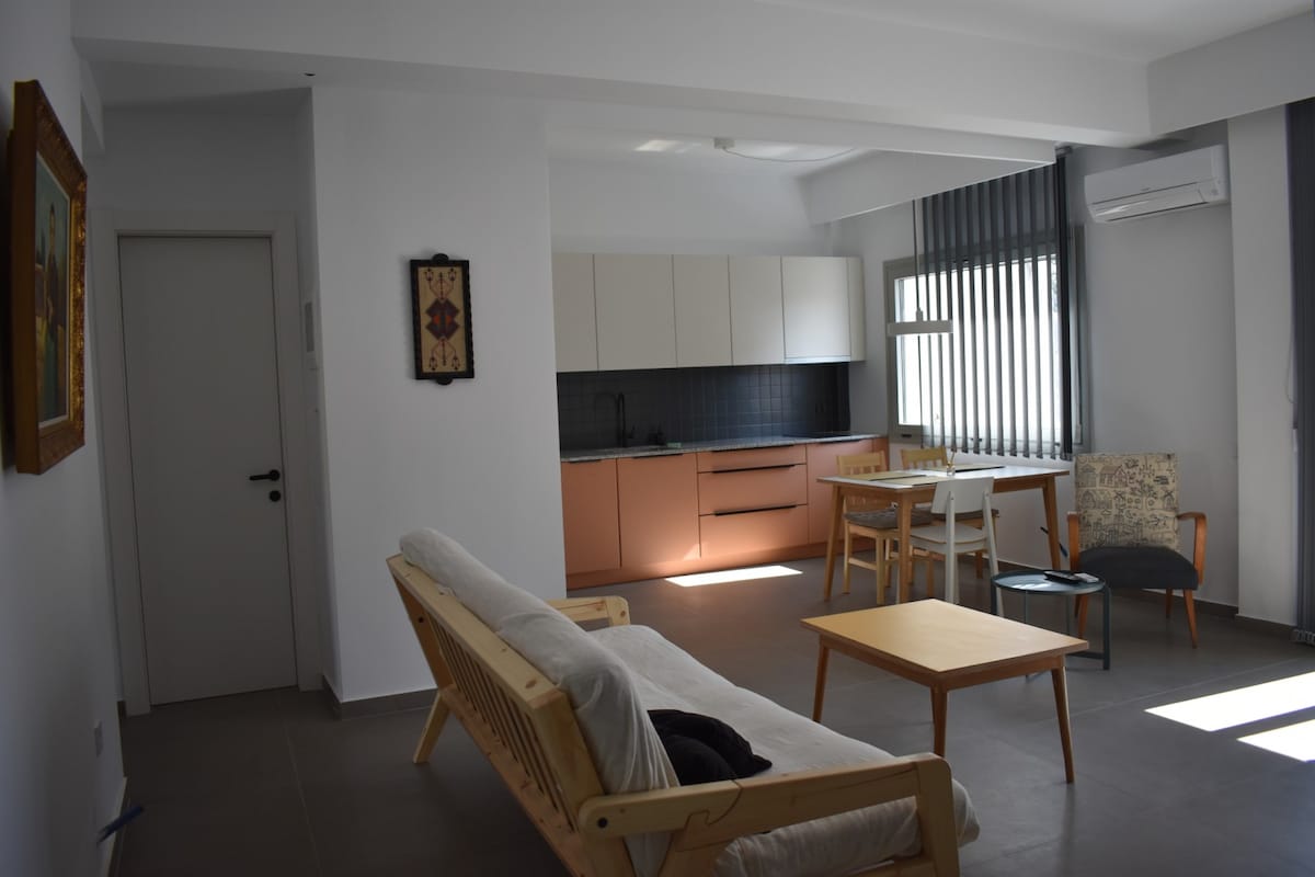 Ervaar de perfecte mix van erfgoed uit de jaren 60 en modern minimalisme. Dit door architecten ontworpen appartement ligt op slechts enkele stappen van het gemeentelijke Katerini-park en biedt een ontsnapping in het hart van de stad. De ruimte is gerenoveerd om zijn vintage ziel te behouden en tegelijkertijd elk hedendaags comfort te bieden. Of je hier nu bent voor een snelle stedentrip of als uitvalsbasis om de berg Olympus en de nabijgelegen stranden te verkennen, je zult genieten van de strakke lijnen, het natuurlijke licht en de rustige sfeer.
