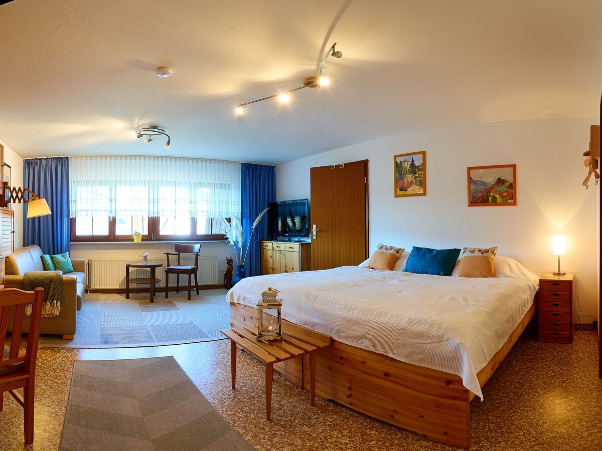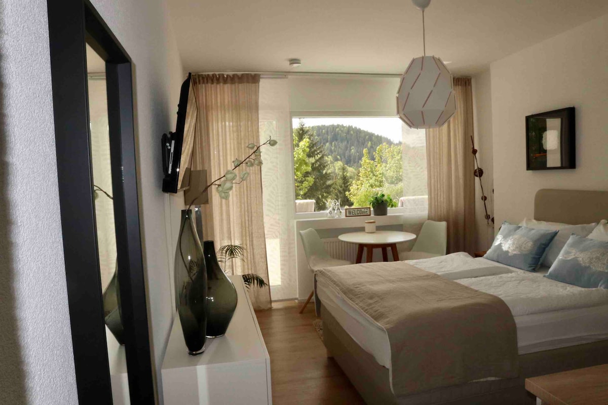 Modern appartement met 1 kamer en terras op een rustige/zonnige locatie met prachtig uitzicht ! Kleinere đ¶ honden zijn welkom bij ons..! Volledig uitgerust appartement en een aparte badkamer met een Frans Bed 1.40 m voor 2 personen ! Het huis ligt op een unieke locatie grenzend aan ons prachtige Zwarte Woud !