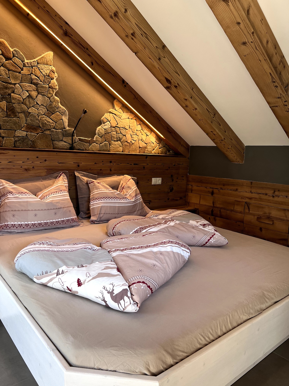 Zolder "Jakob Gereduceerde vormen, zachte kleuren en huiselijk sparrenhout kenmerken de ontspannen en inspirerende sfeer. Twee tot zes personen vinden op 87m² waardevolle rust en ontspanning. Voor extra welzijn: een moderne houtkachel en een eigen panorama-sauna met wellness-ligstoelen. Altijd inclusief het schouwspel van de natuur: bekeken door de ramen, genoten vanaf het 18m² grote dakterras, het 11m² grote panoramabalkon of direct voor de voordeur beleefd.