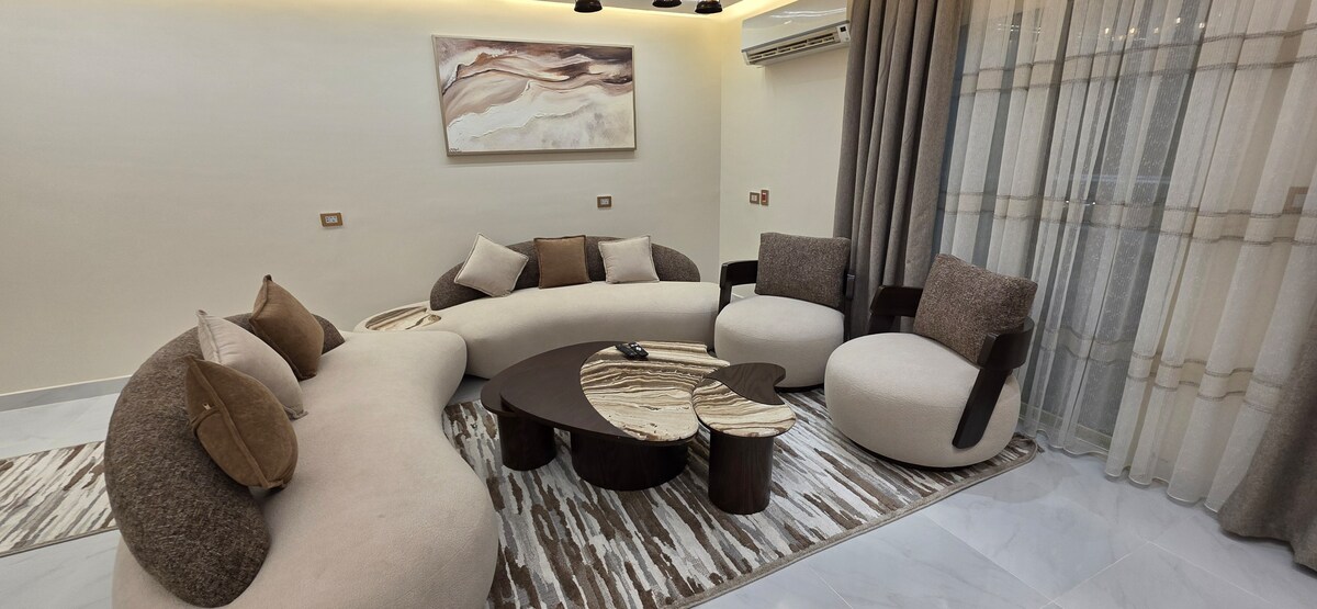 Wat deze plek biedt • 🛏️ 2 slaapkamers (1 master ensuite) + slaapbank • Geschikt voor maximaal 6 gasten • ✨ Nieuw comfortabel met moderne afwerkingen • ❄️ 3 warme en koude airco's + gloednieuwe apparaten • 📺 65 inch smart Google TV • 🌐 Glasvezelinternet met hoge snelheid • 🍽️ Volledig uitgeruste kitchenette • 🛋️ Grote woon- en eetkamer • 📍 3 minuten naar Suez Road • 8 minuten naar Madinaty & Open Air Mall