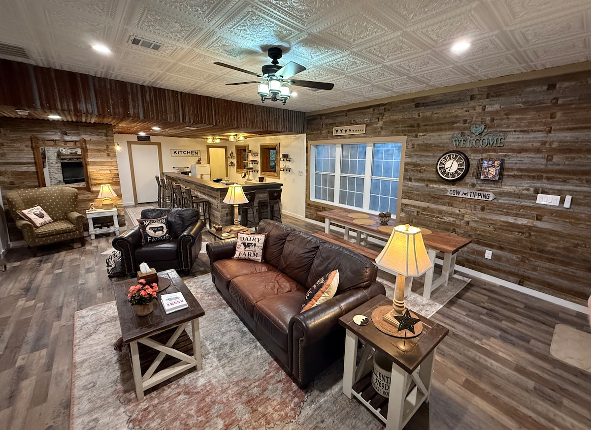 Mijn vrouw Kelly en ik zijn er trots op dat we deze charmante, ruime woning bezitten die we net in 2025 volledig hebben gerenoveerd. In het oude graanhuis achter de oude molen, 'The Farm House Suite', een van de twee aparte suites (in een gebouw vergelijkbaar met een duplex), heeft een grote woonkamer met plafonds van negen voet, keuken (met Toshiba aanrechtoven, koelkast, magnetron, Keurig, vaatwasser) en een ruime slaapkamer. Een persoon kan op de bank slapen en twee anderen op ons queensize luchtbed opblazen.