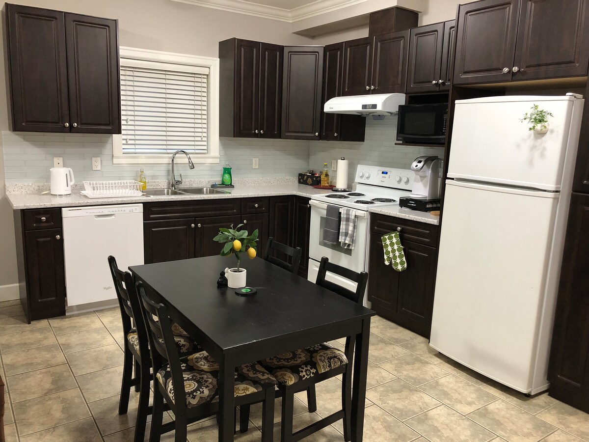 Je hebt ruimte over in deze enorme 1 bdrm suite op de begane grond. Geschikt voor 4 personen met grote slaapkamer met queensize bed en queensize slaapbank in de woonkamer. Eigen parkeerplaats op het terrein. Je bevindt je direct aan de overkant van een winkelplein met Choices-markt, drogisterij, een paar kleine restaurants en meer. Openbaar vervoer is beschikbaar. Geniet van je koffie (inbegrepen) aan de bistrotafel buiten of wandel 50 voet om van het park te genieten. Volledige keuken met vaatwasser, 4 pc-bad, Netflix.