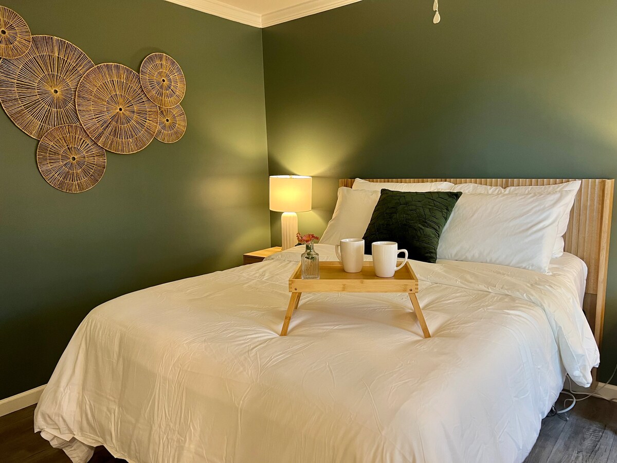This charming and cozy room is thoughtfully designed for comfort and relaxation. The room has it's own private entrance and features a cozy plush queen bed, kitchenette and full bath. Enjoy the warm, inviting atmosphere with soft lighting, and curated touches that make it feel like home. Ideal for solo travelers or couples, this space is located in a quiet neighborhood, close to local attractions, restaurants, Wi-Fi, free parking, and complimentary coffee/ tea are included.
