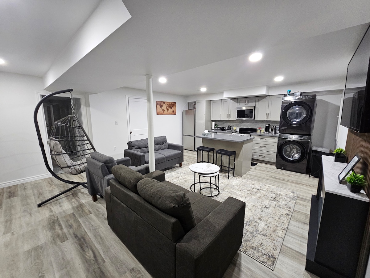 Gerenoveerd appartement op de benedenverdieping van een bungalow op een rustige maar gunstige locatie ten opzichte van de watervallen, het casino en alle bezienswaardigheden in Niagara. 5 minuten rijden naar de watervallen of 20 minuten lopen. Onbeperkte 5G ultra FIBRE Wifi Gratis parkeren Zelf inchecken met code Geen schoenen in het huis Toeslag voor huisdieren $ 70 per huisdier X dag Neem een bed of kooi voor je huisdier mee om ongelukken te voorkomen. Ze zijn niet toegestaan op de bank of bedden voor hygiëne (als dit toch gebeurt, is er een toeslag van $ 70) Roken binnen kost (150)