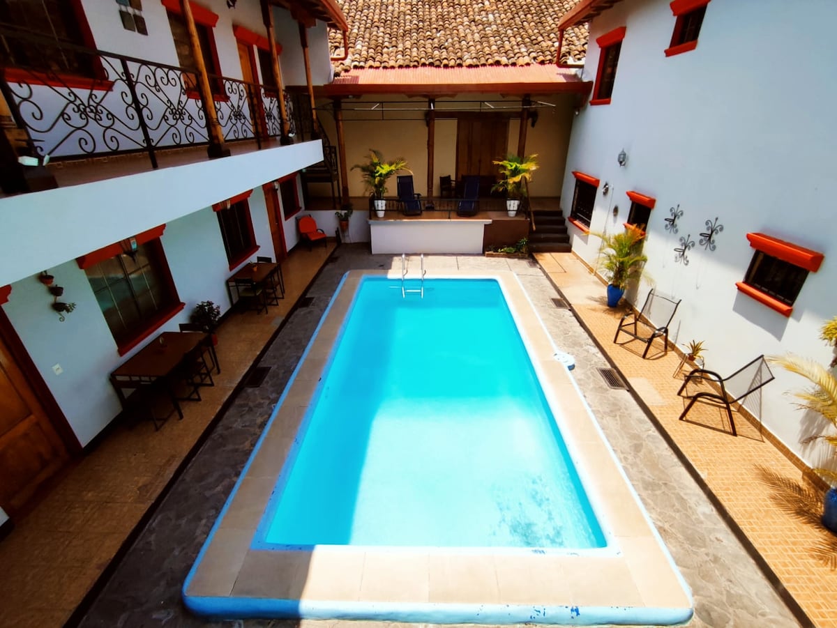 Privé-appartement, centraal gelegen in de stad Granada, voor 6 gasten: 3 slaapkamers, 2 met airconditioning, eigen badkamers, gedeeld zwembad en parkeergelegenheid binnen of buiten het hotel. ★ Drie blokken verwijderd van La Merced Church en vijf blokken verwijderd van Central Park. Je bent ook dicht bij Pali en de gemeentelijke markt. Wij coördineren de volgende diensten (extra kosten) ★ Shuttleservice ★ Shuttle ★ Kajaktochten ★ Rondleidingen op de eilandjes ★ Rij in een zijspan ★ Mombacho-vulkaan ★ Laguna de Apoyo
