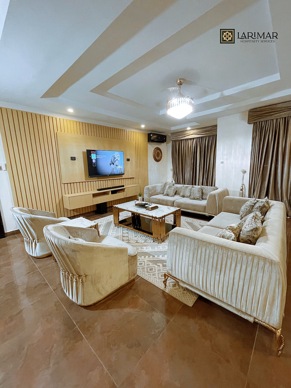 This Sparkling Clean Executive 2 bedrooms apartment comes with modern ensuite rooms with visitors toilets, Super king bed in all rooms and very spacious and massive. Unlimited fast WI-FI, 43inche Smart TV in all rooms and 55 inches Smart Tv in the sitting room. Water heater, Air conditioning, Netflix, YouTube, DSTV. Blinded cottons, water kettle, 24/7 electricity Band A from grid.Maximum security with uniform guards & trained guard dog. Spacious & clean compound with enough parking space.
