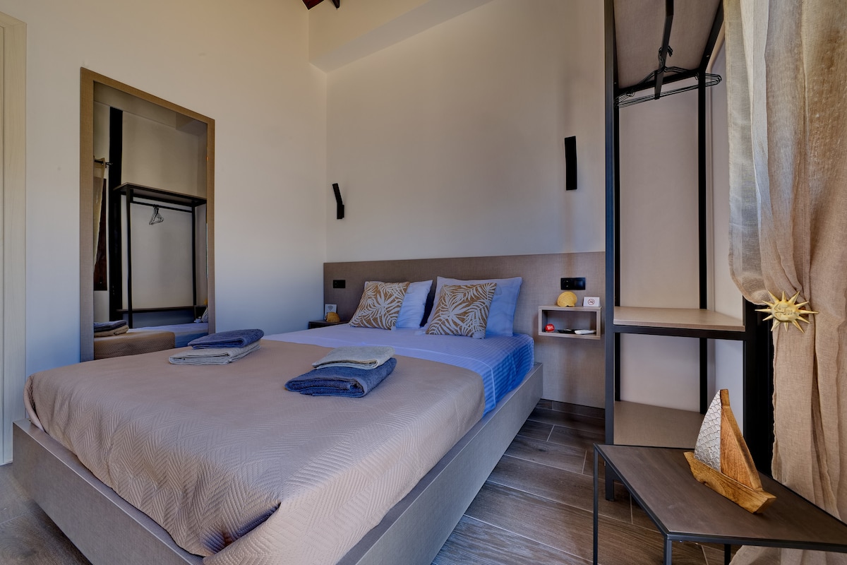 Stap in onze elegante Junior Suite met 1 tweepersoonsbed in HP Family Suites, ontworpen voor comfort en ontspanning. De suite beschikt over een prachtig gemaakt houten bed, aangevuld met luxe beddengoed en kussens. De kamer is versierd met een moderne inrichting en warme verlichting, waardoor een gezellige sfeer ontstaat. Geniet van het ruime balkon met prachtig uitzicht op zee, perfect om te ontspannen na een lange dag. De suite heeft een eigen badkamer met een strakke, moderne douche, die zorgt voor een verfrissend begin van je dag.
