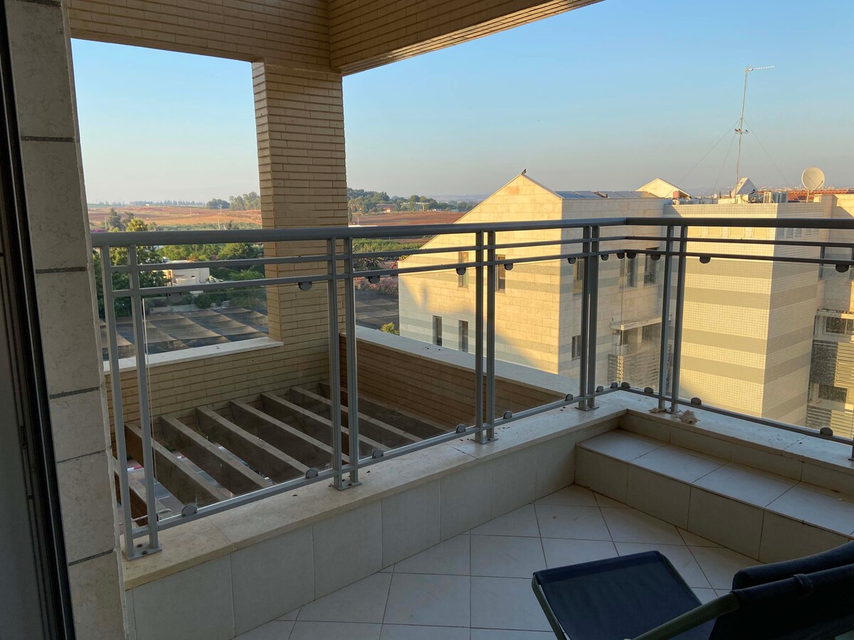 * There are enough bedsheets and towels for 5 people. The main bathroom is very spacious. A door from the main bathroom leads to the laundry room with a washing machine, dryer and cleaning tools. * The kitchen is well equipped with all the cooking and eating utensils that are needed. The kitchen opens up to a dinning area and a living room with a large sliding door connecting to a balcony overlooking Moshav Tsofit (The apartment is located on the 6th floor). * The apartment is fully furnished and has central air-conditioning capable of cooling in the summer or heating in the winter.