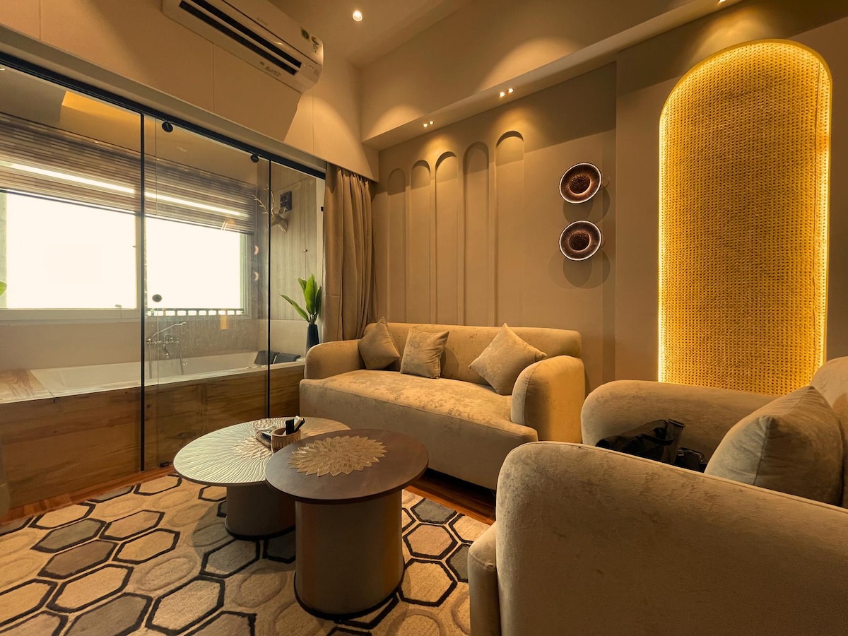 Experience city living like never before in this modern boho-style premium 1BHK with a stunning river view. Designed with elegance, comfort, and luxury in mind, this apartment features high-end furnishings, cozy aesthetics, and hotel-like amenities all wrapped in a calm, peaceful vibe. Whether you’re here to relax, celebrate, or work in style, this space offers a five-star experience with nature right outside your window.