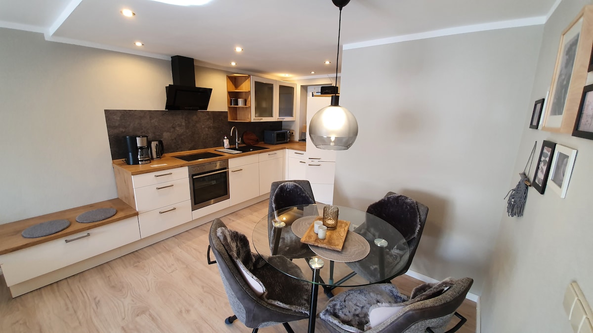 Ons comfortabele appartement is net volledig gerenoveerd na langetermijnverhuur en wacht nu op leuke gasten die erin willen ontspannen en vooral in onze prachtige natuur aan de rand van de zuidelijke Harz. Het appartement zelf is toegankelijk. Het pad van de parkeerplaats op het terrein naar de toegangsdeur van het huis leidt over oppervlakken die zijn geplaveid met een dwarshelling.