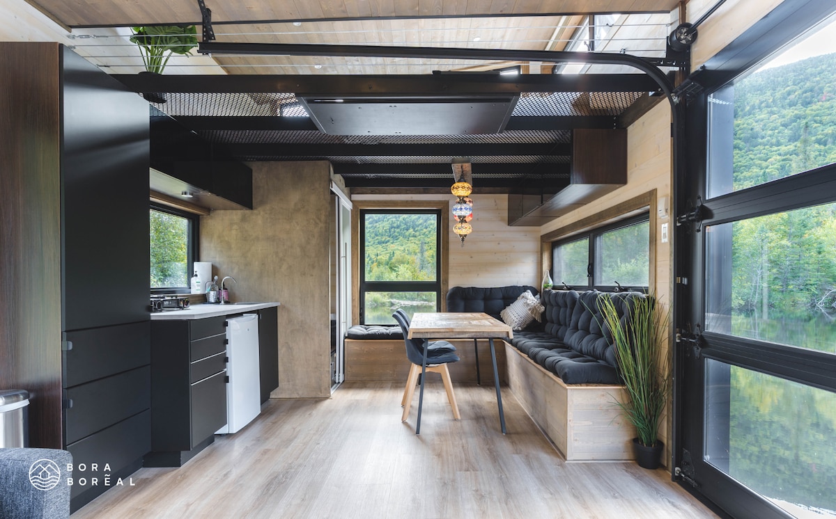 Drijvende hut — Minibora Le bolet (maximaal 4 gasten) Een lichte en uitnodigende woonruimte: - Glazen garagedeur voor een meeslepende ervaring aan het water - Volledig uitgeruste keuken en privébarbecue Slaapkamerindeling: - Open slaapkamer met tweepersoonsbed - Modulaire banken: 2 eenpersoonsbedden of 1 tweepersoonsbed Inbegrepen zijn: - Brandhout - Lokaal gebrande koffie - 11 Comtés ambachtelijk bier - Suppen en kajaks in de zomer - Sneeuwschoenen in de winter Hondvriendelijk (extra vergoeding) CITQ: 302677