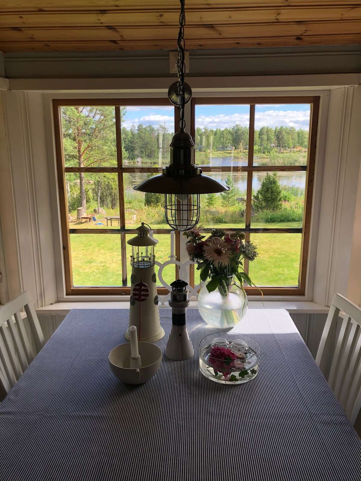 Cozy cottage of 65 m2 right by the lake, first line with stunning water views. Surrounded by peaceful forest, perfect for nature lovers seeking quiet and relaxation. Enjoy morning coffee or sunset wine on your own jetty. Ideal getaway for couples or small families. Breathe fresh air, hear the birds, and unwind completely. A hidden gem by the water! Nicely decorated for Christmas with a cosy fire-place inside and outdoor fire baskets. 30 min to Bollebacken, ski- resort.