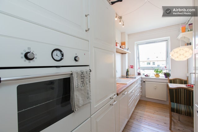 Mijn appartement bevindt zich op de derde verdieping van een 300 jaar oud erfgoedgebouw. Het is belangrijk op te merken dat er geen lift is, wat gebruikelijk is omdat minder dan 9 procent van de gebouwen in de binnenstad van Kopenhagen liften heeft. Houd dit in gedachten als je zware bagage hebt. Mijn onlangs gerenoveerde appartement beschikt over een gang die naar de badkamer leidt en een woonkamer die uitkomt op het slaapgedeelte en de keuken. Het biedt een gezellig (Hyggeligt) uitzicht op de daken van de stad.