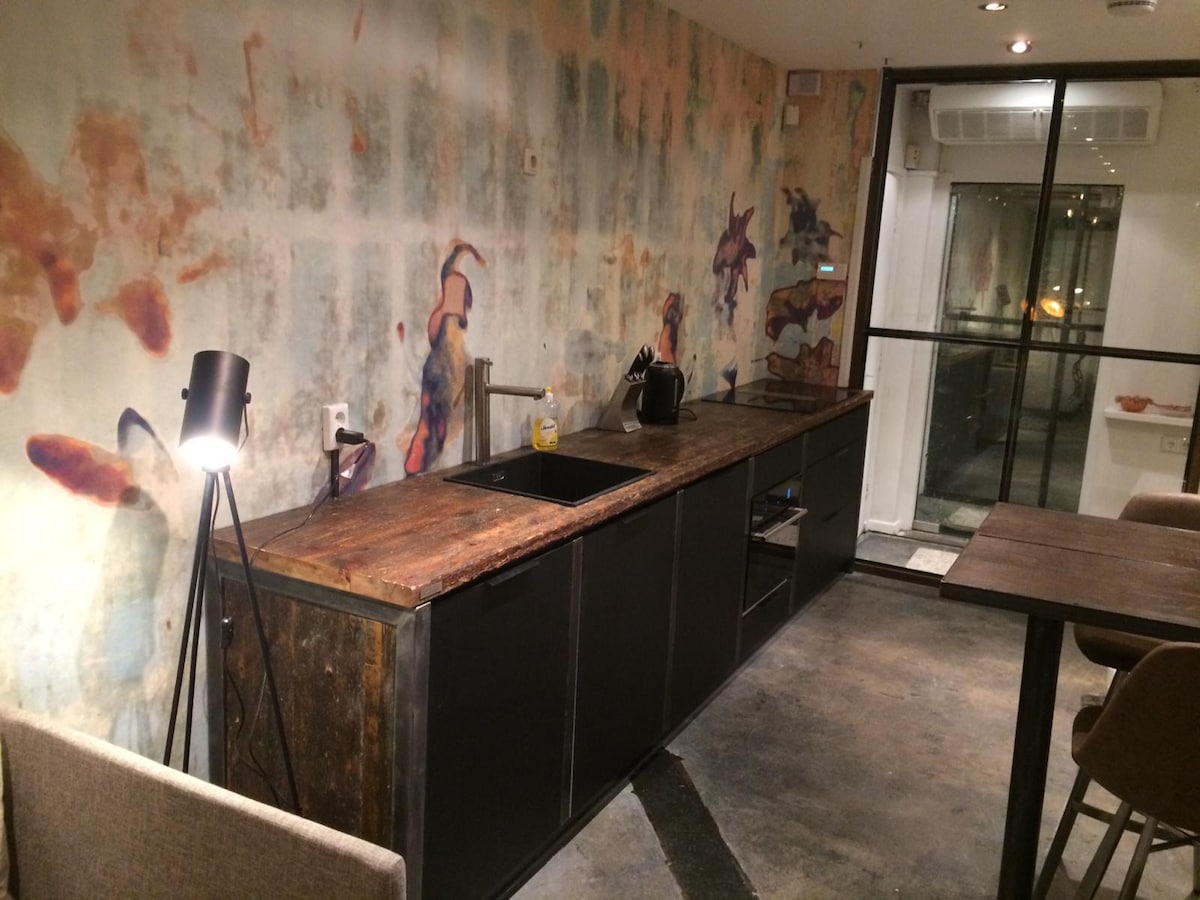 🔑 Zelf inchecken kan, hoeft niet. 🏡 Fijne studio met airco, tuin en parkeerplaats, om de hoek van Cassandra plein met winkels. City center 2.7 km — 7 min by car 🚗, 13 min by public bike 🚲 (if available), 30–35 min walk 🚶♂️. TU/e or Strijp-S — 9 min by car. Woondeel met slaapbank 140x200, keuken, koelkast, wasmachine, inductiekookplaat, afzuigkap en spoelbak. Open-plan bedroom met kledingkast en tweepersoonsbed 140x200. Badkamer met toilet, wastafel en douche.