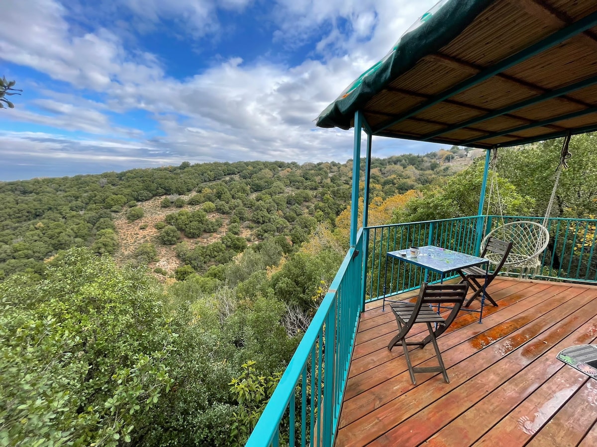 Een magische hut in een Galileïsch landschap, uitgerust met alles, met uitzicht op het bos met een buitentuin en uitzicht op de bergen Een tweepersoons bad buiten Buitenzitje, vuurtafel TV met een verscheidenheid aan zenders wifi Airconditioners in de slaapkamer en in de woonkamer Volledig uitgeruste kitchenette Kruiden in de tuin voor thee Nespresso-machine lakens en handdoeken, Warmwatersysteem Optie voor heerlijk dubbel ontbijt