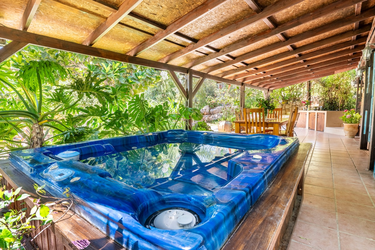 In het hart van de wilde natuur van het noorden van de Golan Heights, tussen de gedoofde vulkanen, kristalheldere bronnen, oude boomgaarden en adembenemende landschappen bouwden een huis dat de natuurlijke omgeving perfect weerspiegelt. De muren van onze ecologische huizen zijn bedekt met aardepleister en onze ramen zien geweldige zonsondergangen en een open uitzicht. Het huis is ruim en geschikt voor groepen. In de pergola met uitzicht is er een enorme en eigen spa-jacuzzi, zithoeken, in de winter een open haard die het lichaam en het hart verwarmt en de keuken is uitgerust met alles wat nodig is. Onze eetbare tuin groeit speciale bessen en een verscheidenheid aan groenten die beschikbaar zijn om te plukken voor onze gasten. Let erop dat dit een woonhuis is.