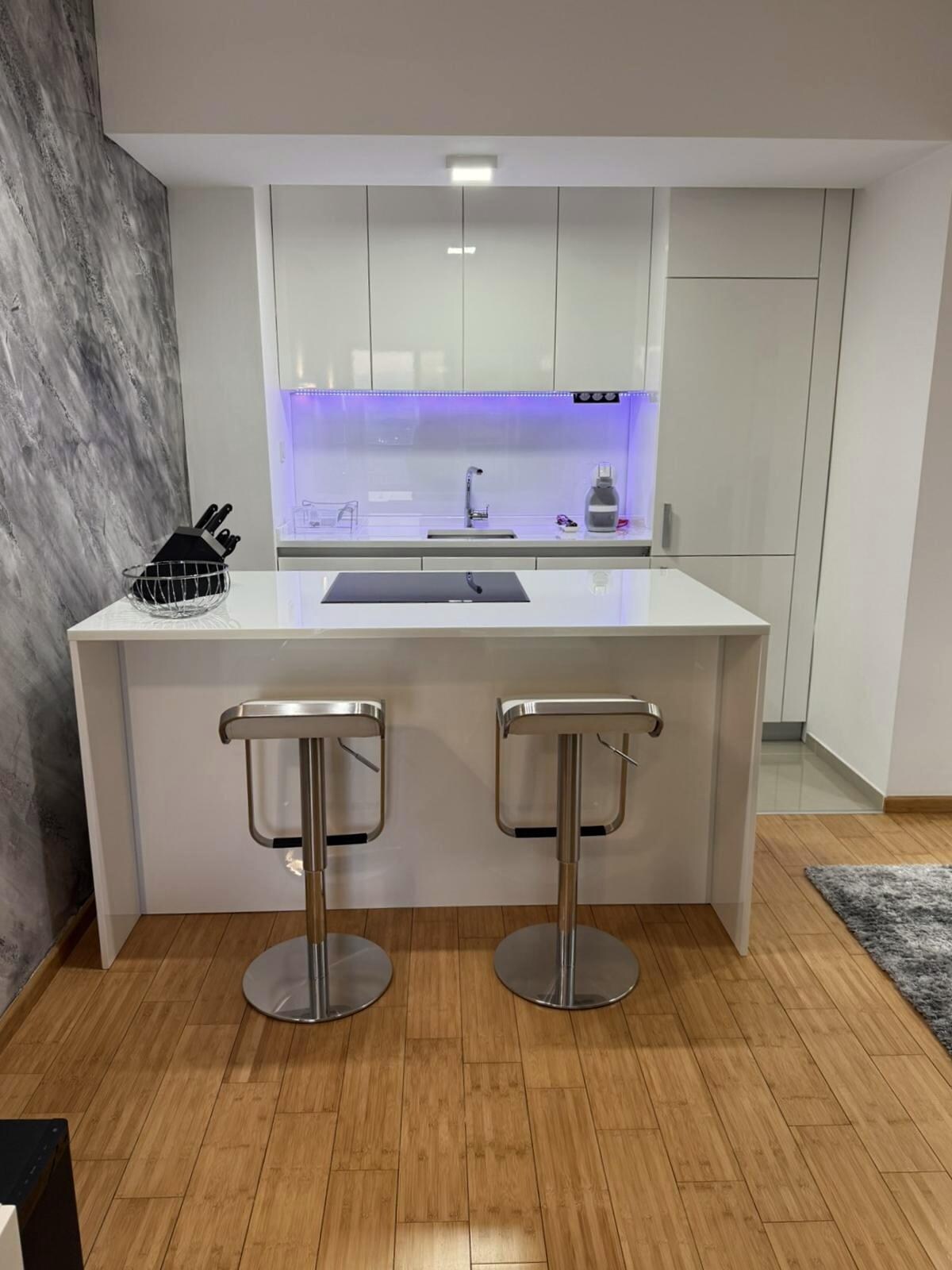 Dit appartement op de bovenste verdieping is perfect voor diegenen die midden in de stad willen zijn, maar toch een rustige ruimte willen hebben om te ontspannen en te genieten. Het appartement bevat een thuisbioscoop met Netflix en ultramodern geluidssysteem. Je kunt ook rechtstreeks vanuit de lounge genieten van uitzicht op de skyline van Skopje en de berg Vodno. Het appartement is geschikt voor werk of reizen en beschikt over snel internet, evenals een groot bureau met een comfortabele leren stoelen, evenals nog twee kleinere speciale werkruimtes.