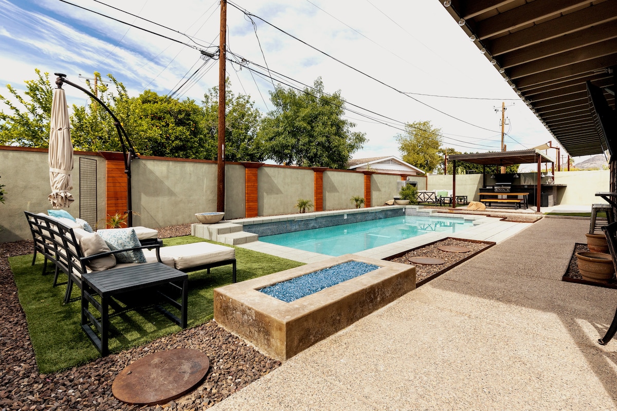 🏊 Year-round relaxation in heated saltwater pool (gentle on skin/eyes) 🔥 Cozy up by 4 outdoor gas fire features 🍖 Grill for groups at outdoor BBQ/kitchen 🛋️ Warm ambiance from indoor gas fireplace 🍳 Fully stocked kitchen with everything needed ✨ Tasteful design with high-end finishes/fixtures So much to enjoy, you won't want to leave! But if you do: 20 min from Sky Harbor, Scottsdale & top golf like Lookout Mountain. Resort-like feel in quiet N Central Phoenix – ideal family / golf retreat