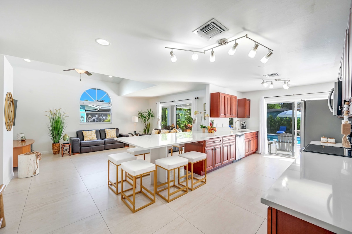 Gloednieuw gezinsverblijf met 4 slaapkamers en 3 badkamers op één verdieping in Naples Park. Verwarmd privézwembad met zout water, gourmetkeuken van KitchenAid, gemakkelijke toegang tot het strand aan de Golfkust en vier extra grote slaapkamers die aanvoelen als privésuites. Comfortabel geschikt voor 7 personen — ideaal voor gezinnen, groepen of werken op afstand. Overal snelle wifi. Toegang tot het strand en strandbenodigdheden aanwezig. Verken bezienswaardigheden in de buurt, zoals Delnor Wiggins State Park en Vanderbilt Beach, voor onvergetelijke familieherinneringen.