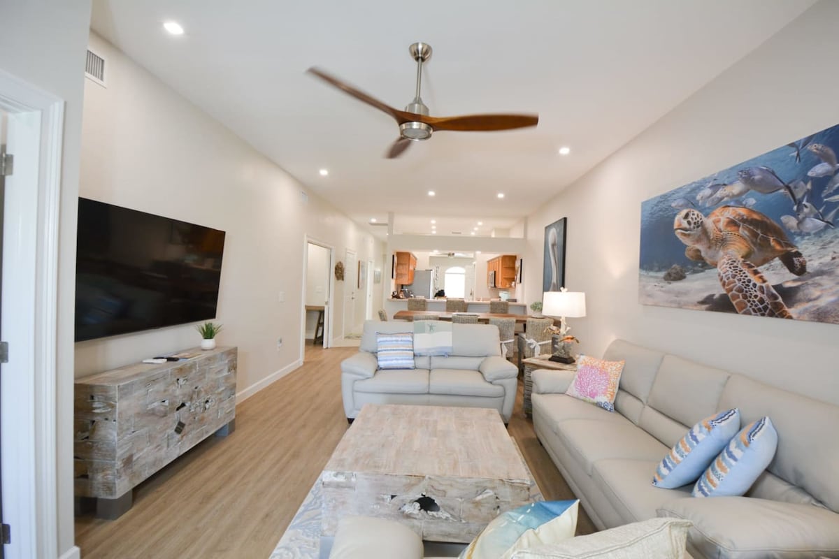 Omgeven door water. Volledig gerenoveerd. Met uitzicht op het zwembad en de baai vanuit de woonkamer en de hoofdslaapkamer en met uitzicht op de oceaan (Golf van Mexico vanuit de slaapkamer). Privéstrandtoegang tot de Golf van Mexico aan de overkant van de afgelegen straat. Oceaan- en baaibriesjes maken het op elk tijdstip van het jaar comfortabel. Dolfijnen spelen bijna elke dag buiten je voorruit. Wildlife sanctuary; Geweldig winkelen; Geweldig vissen direct aan het dok of de kust. Uitstekende buurt, extreem veilig.