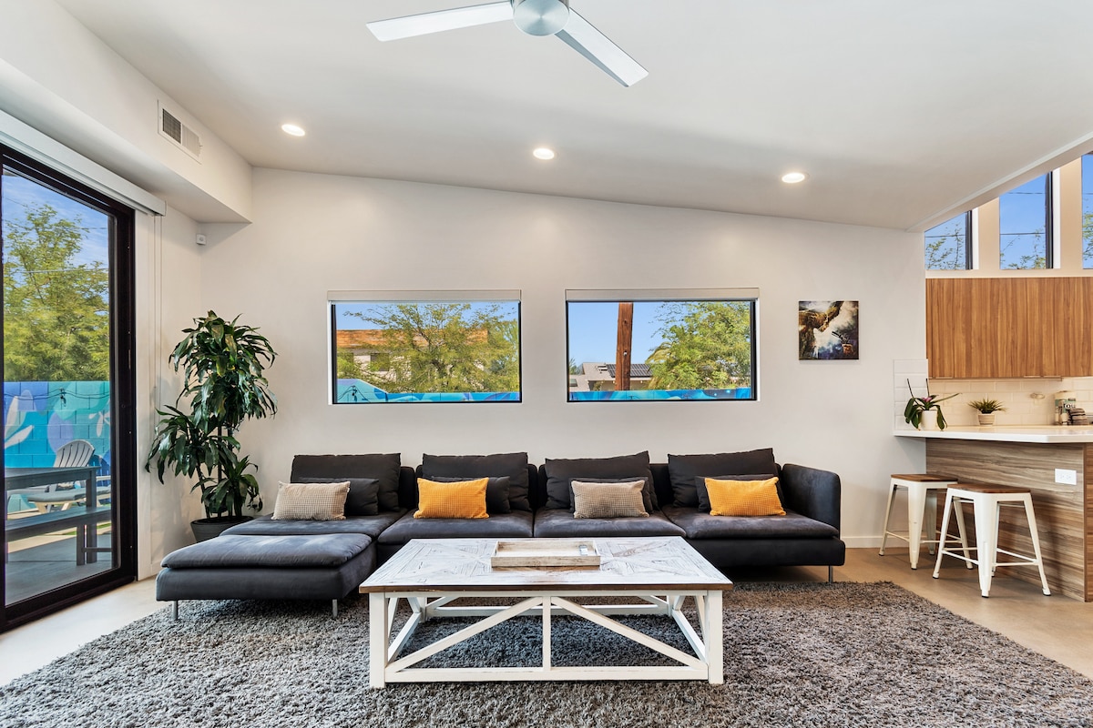 Lage schoonmaakkosten! Superleuke luxe accommodatie! PERFECTE locatie! Droomachtig privéverwarmd zwembad (verwarming inbegrepen), chef-kok, twee kingsize bedden en vier stapelbedden. Loop naar Starbucks (en andere plekken). Maak foto's met de unieke muurschilderingen. Vier HD Smart-tv's! Woning is modern en ruim genoeg voor elke grootte groep! Familie-eigendom, geëxploiteerd en zorgvuldig verzorgd. De buurt is super chill en handig voor alles! Super lage kosten! Lees onze recensies! We Care! @GoodVibesScottsdale