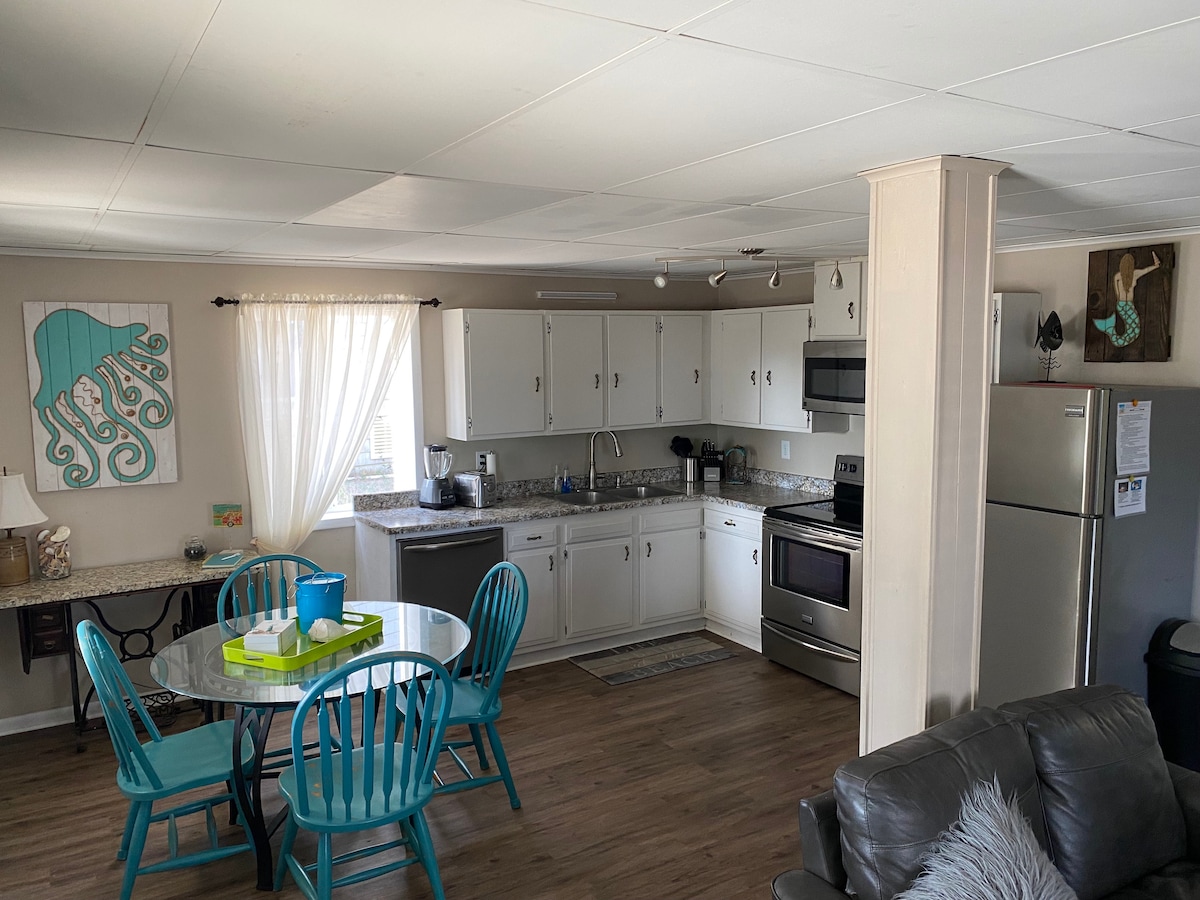 Studio just a 3min walk to the beach and the sound! Professionally decorated to welcome you to the Topsail lifestyle. Perfect for a couple or a getaway for just you. Open living area with a casual contemporary sofa, featuring a full kitchen with high-end appliances. Bistro dining area to enjoy the local fare. Queen bed comfort for sweet dreams! Beautiful bath with large walk-in shower and custom vanity. Bring as many clothes as you like, the closet is Fabulous. Smart TV with WIFI.